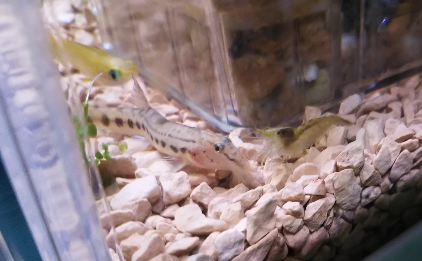 そんな合流槽ではシマドジョウとミナミヌマエビが争うでもなくザリガニ用の固形餌を交互に食べ合う光景と覗きに来たメダカ。