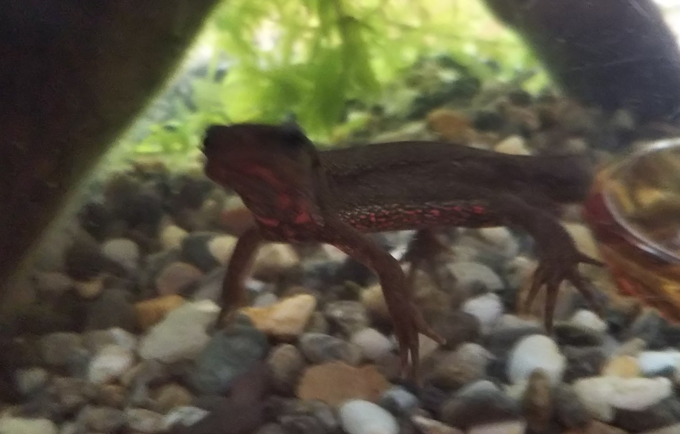 まだ迎えて日が浅いので、環境はプラケースに流木とアナカリス束の陸地と簡易的。
