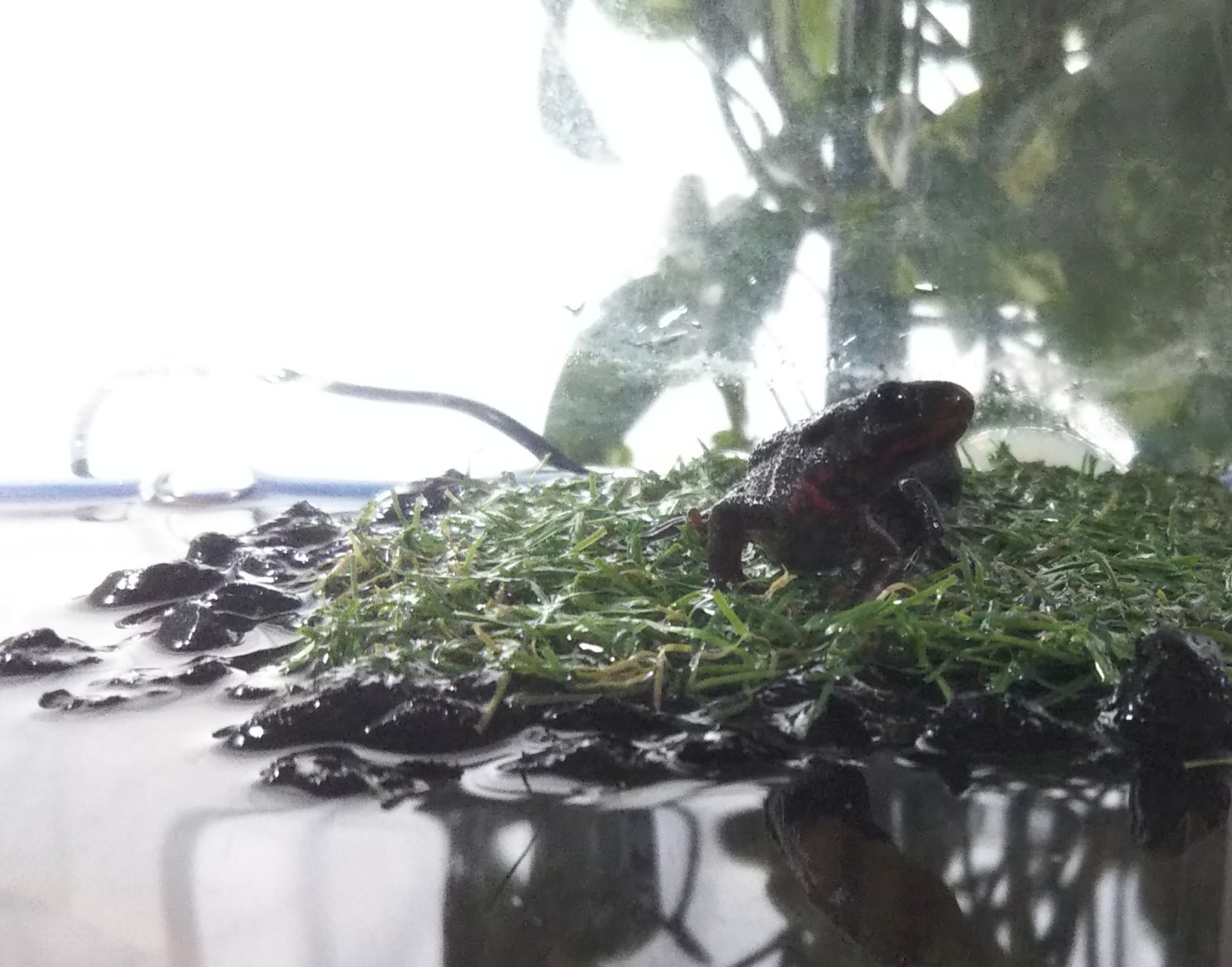 以前、100均カラーボードと鉢底ネットにバークチップで作ったフローティングランドに100均人工芝マットを貼り付けて完成させた。