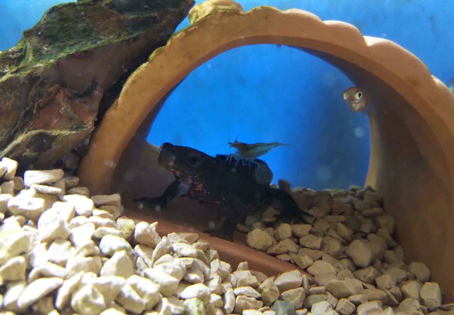 で、卵があった水槽でイモリがミナミを背中に乗せて歩いてたので撮った。